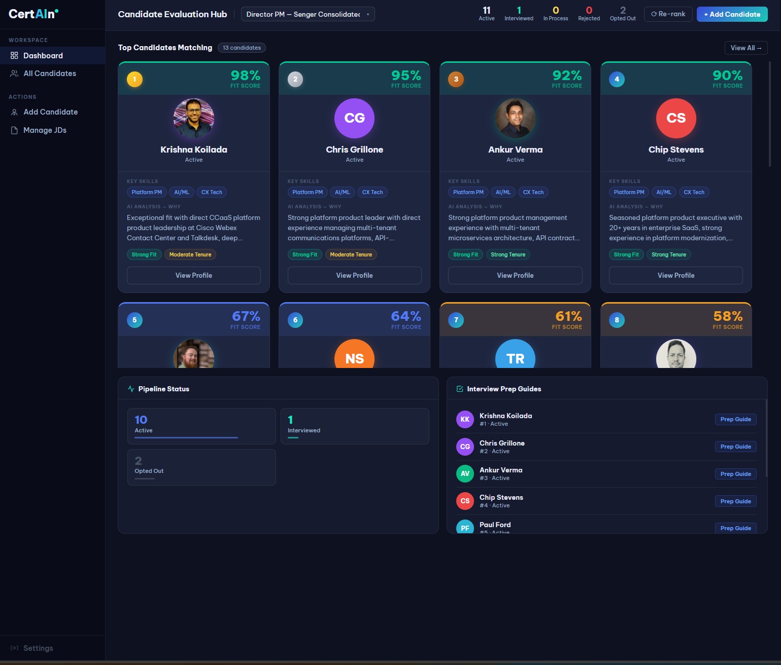 CertAIn is AI hiring that explains itself. It reads every candidate against your JD and returns a reasoned fit assessment — ranking, interview prep, and post-interview analysis — with the reasoning a recruiter can defend.